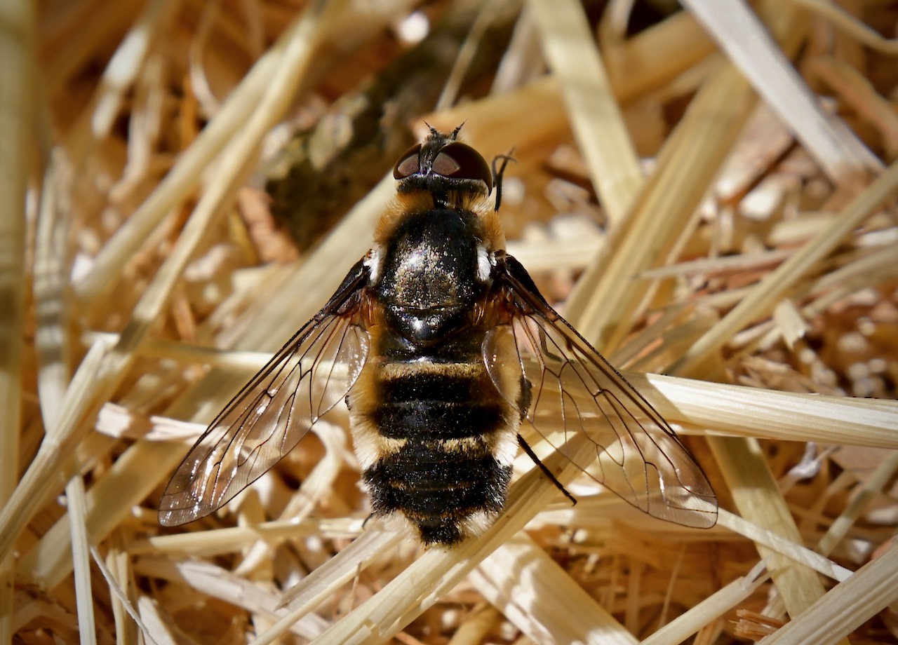 Villa alternata is one of many species of “Bee Fly” found around the world, it uses Batesian mimicry to fool would-be predators by having the colors and patterns of stinging bees. They lay eggs in the ground (below) and their larvae will seek out and parasitize ground living moth and beetle larvae.