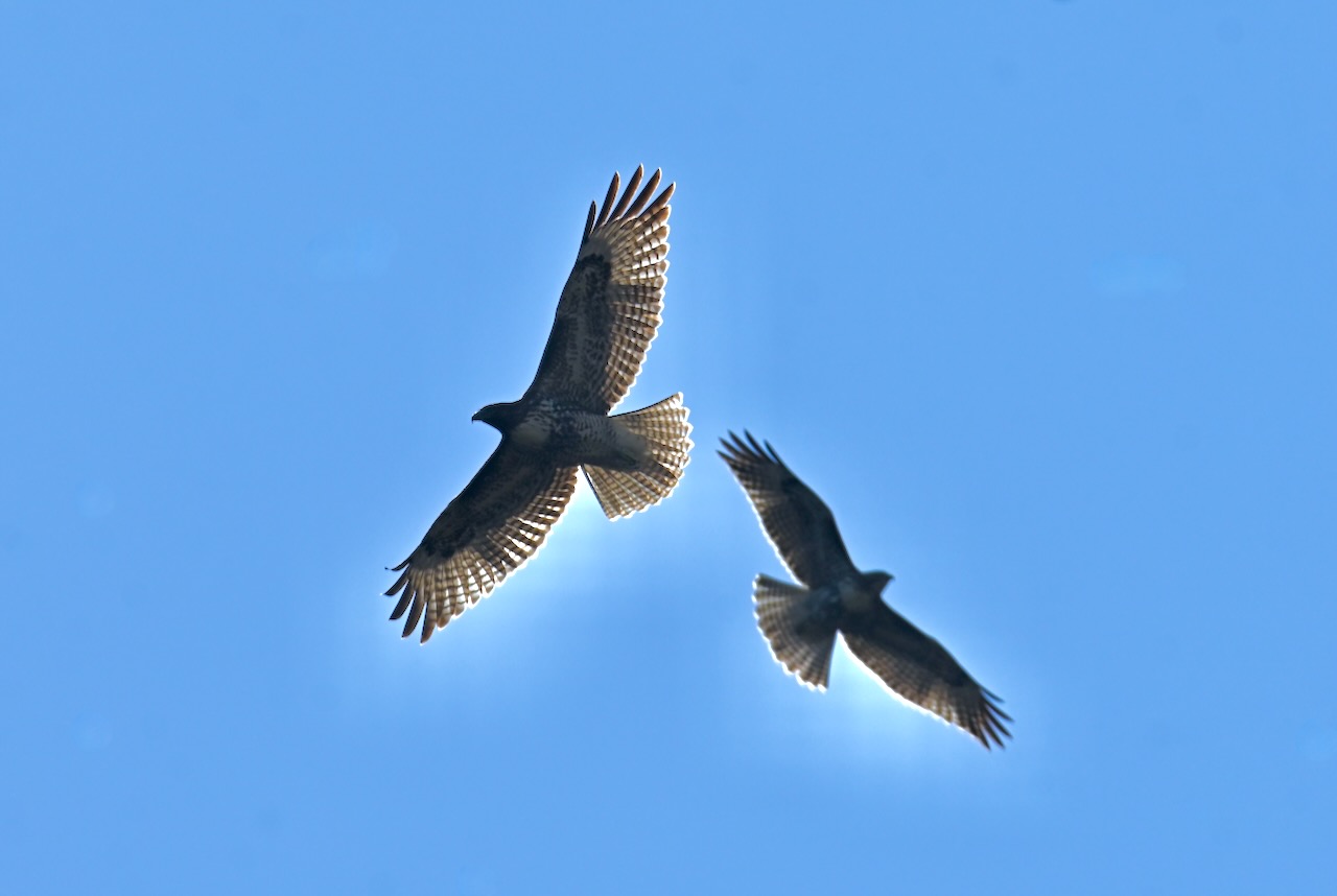 Raptors and other large birds utilize the updrafts created by hot air masses to gain altitude while conserving energy. Similar to the way sailboats can tack into the wind, birds are able to maneuver within a rising column of air, called “dynamic soaring”. There’s some debate about how birds find thermals but once one is found, other birds take notice and join the ride. This thermal had ravens, turkey vultures, red-shouldered hawks, red-tailed hawks and a young golden eagle. A delicate balance of amicable shared endeavor and testy little jostlings for space.
