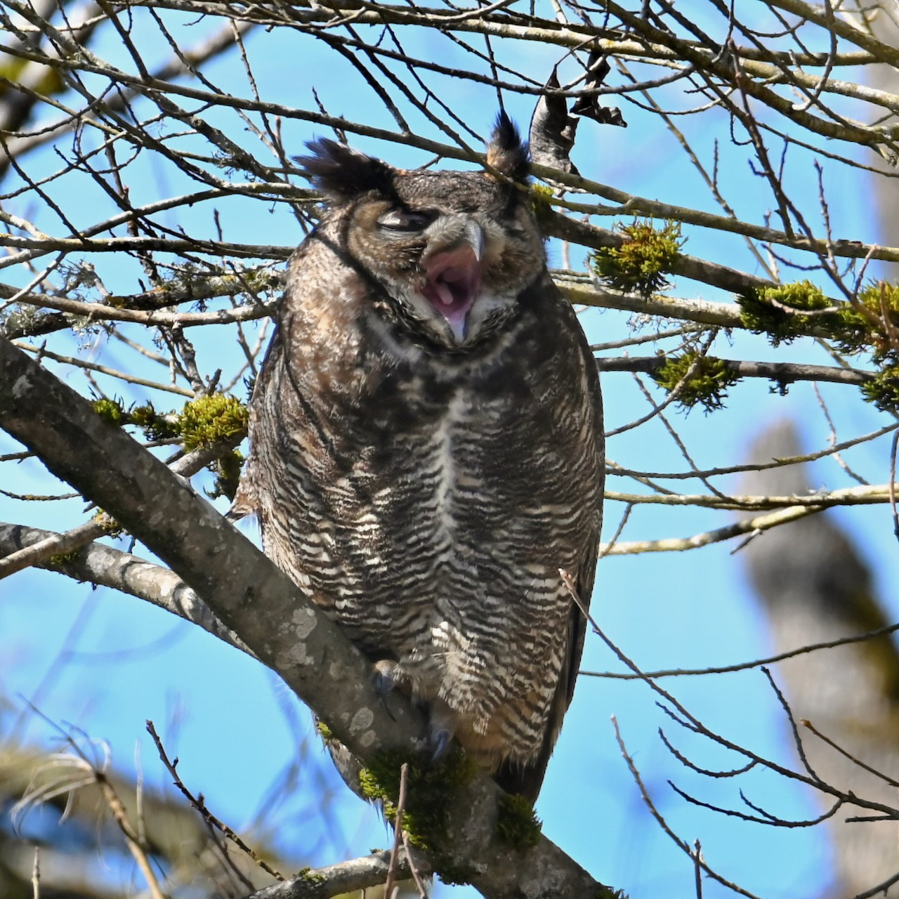 Great horned owls prefer hunting in the dawn, dusk and through the night, daytime hours are spent yawning, preening and sleeping.